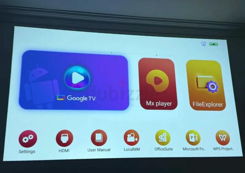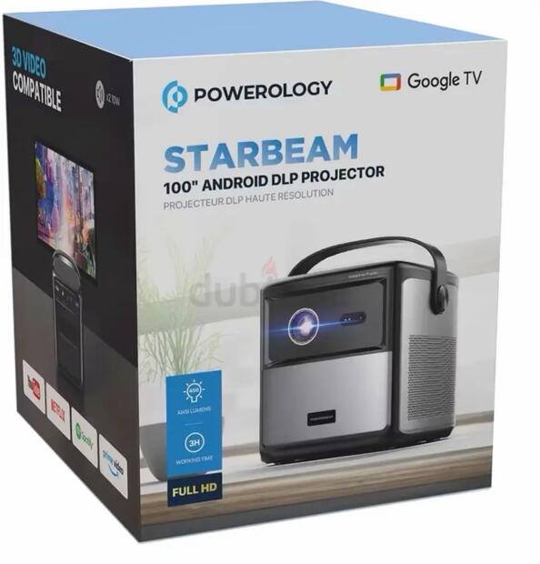 The Powerology 4K GTV Projector is a versatile and compact device designed for immersive entertainment. Powered by a 15,000m Ah battery, it offers up to 190 minutes of usage in power-saving mode, making it ideal for on-the-go viewing. With its 1.2:1 throw ratio, the projector delivers sharp visuals on large screens, while the Amlogic S905Y4 Quad A35 CPU and ARM G31