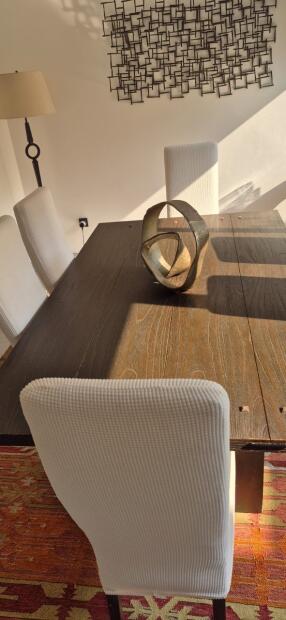 Elegant solid wood dining table from The One, paired with six comfortable high-back chairs. The set has been gently used and is well maintained. Table has a rustic, natural wood finish that fits both modern and classic interiors. Chairs come with clean, fitted off-white covers for a fresh look and easy maintenance.