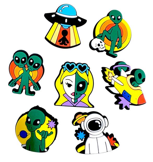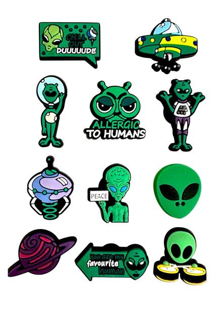 This is a 2 gift bundle croc, shoe charms, jibitz. You will get 2 bundle of alien-themed charms as seen in the photos. Beautifully packed inside sealed sachets. Additionally you will get free mixed stickers inside ( your favorite stitch alien!)