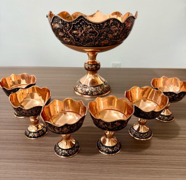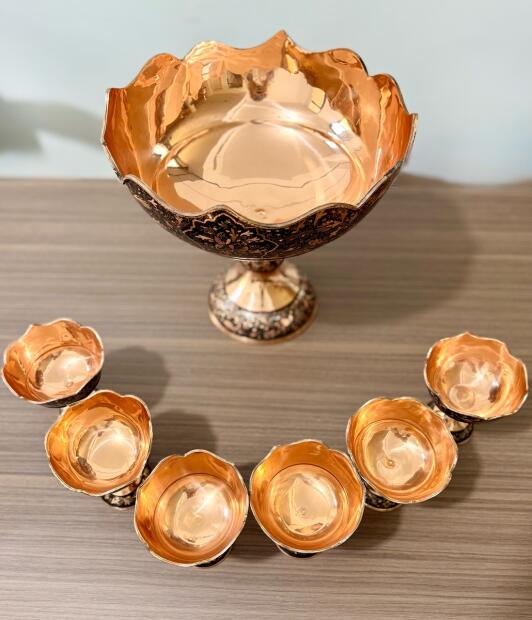 I'm excited to sell this exquisite vintage copper bowl set that I've kept carefully stored away. Perfect for adding a touch of elegance to any occasion, this set includes a beautifully detailed centerpiece bowl and eight matching bowls. Each piece is adorned with intricate black etchings on a polished copper surface, showcasing stunning craftsmanship that enhances their decorative appeal. Known for both their aesthetic and functional qualities, these bowls can be used for serving snacks, desserts, or simply as a striking centerpiece in your home. They are in flawless condition and have never been used, making them a great addition for collectors or those looking to enhance their home decor. Don’t miss out on this beautiful set that blends vintage charm with modern elegance!