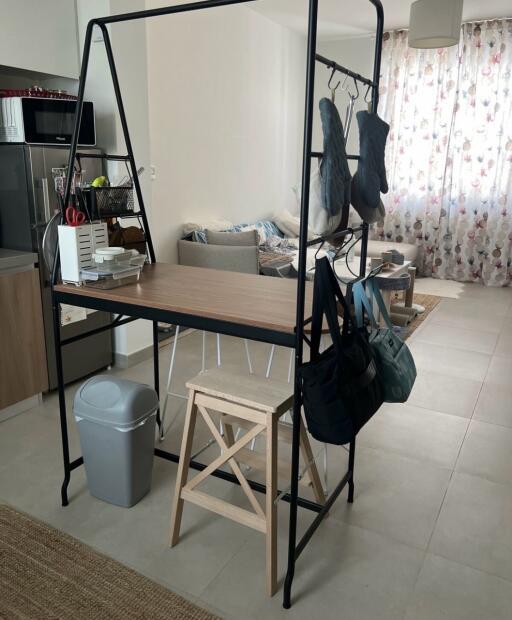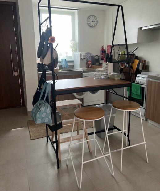 This versatile kitchen table is designed to enhance both small and large living spaces by providing a practical area to prepare meals. It features ample storage options, including hooks, baskets, burlap pouches, and a kitchen roll holder, helping you keep your essentials organized and within reach. The set includes two bar stools, adding convenience and functionality. Crafted in excellent condition, with no damages or dents, this table is a reliable and stylish addition to your home furniture collection.