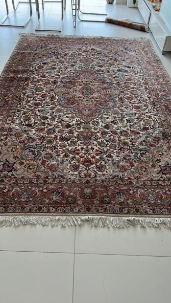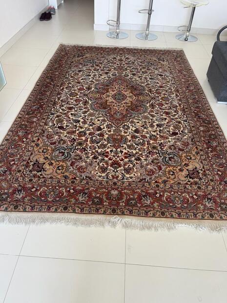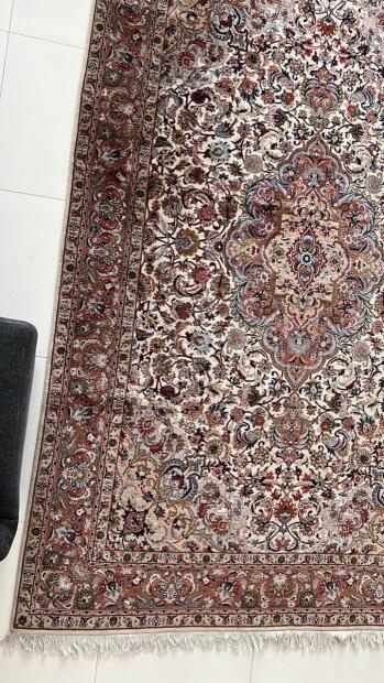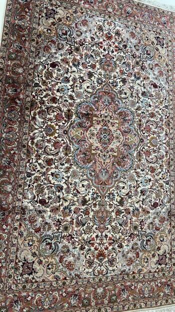 Beautiful original Tabriz carpet with rich floral design and fine detailing. Handmade from high-quality wool with cotton fringes and elegant traditional patterns in ivory, burgundy, and blue tones. Excellent condition and adds luxury to any space.