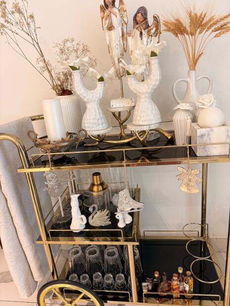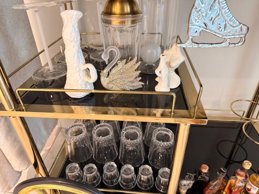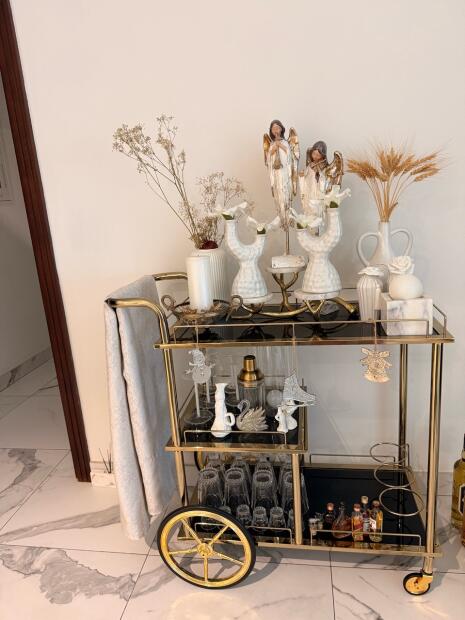 I'm selling this elegant gold bar cart the decoration items can be added by interest do for an additional fee.It's in good condition and adds a touch of sophistication to any gathering. The cart features a sleek design with ample space for your favorite beverages and glassware, making it perfect for entertaining guests in style. It's not just practical, but also a statement piece that can elevate your home decor.